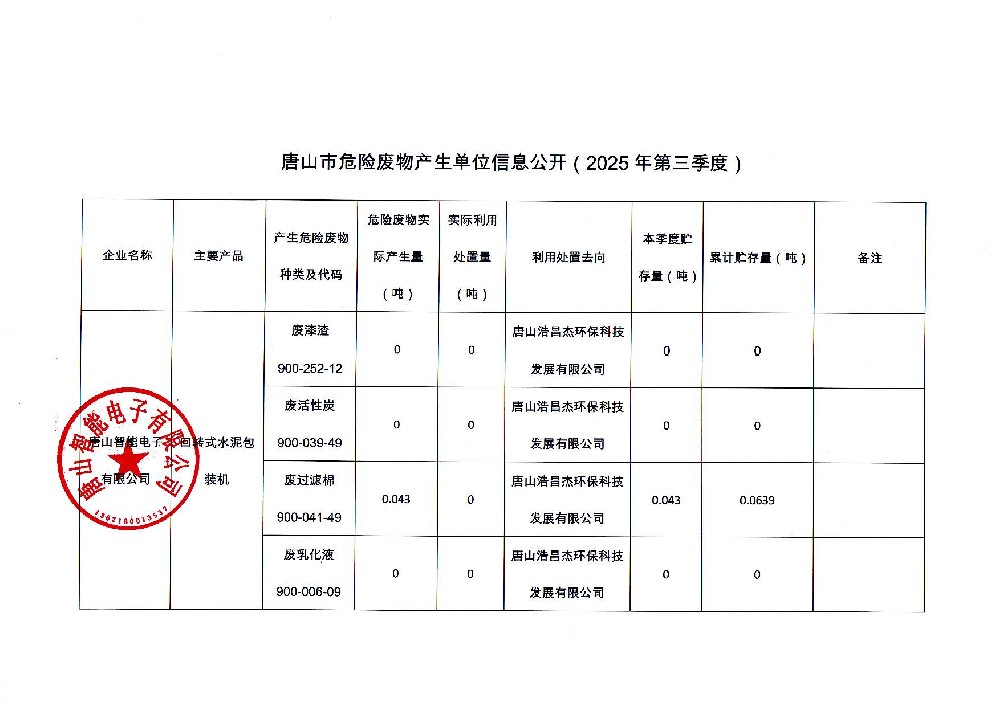 唐山智能電子有限公司2025年第三季度信息公開